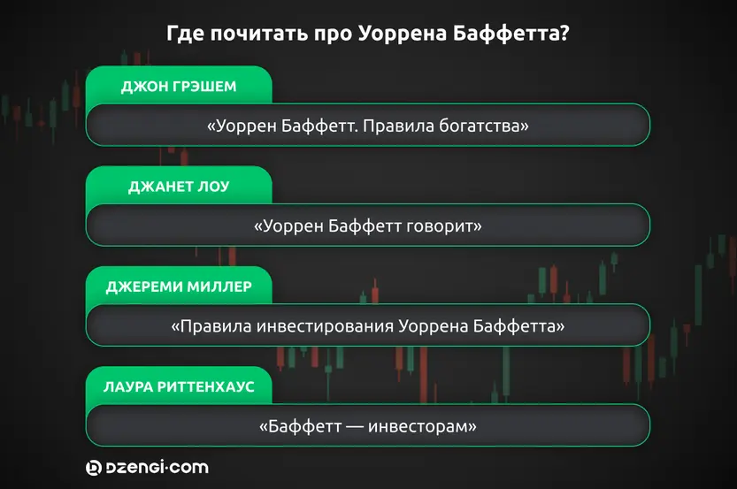 Целый ряд книг написан другими авторами по мотивам советов финансиста. Например, Джон Грэшем написал книгу «Уоррен Баффет. Правила богатства», Джанет Лоу - «Уоррен Баффет говорит», Джереми Миллер собрал и систематизировал советы инвестора из Омахи в «Правилах инвестирования Уоррена Баффета», а многостраничный труд Лауры Риттенхаус называется «Баффет — инвесторам».