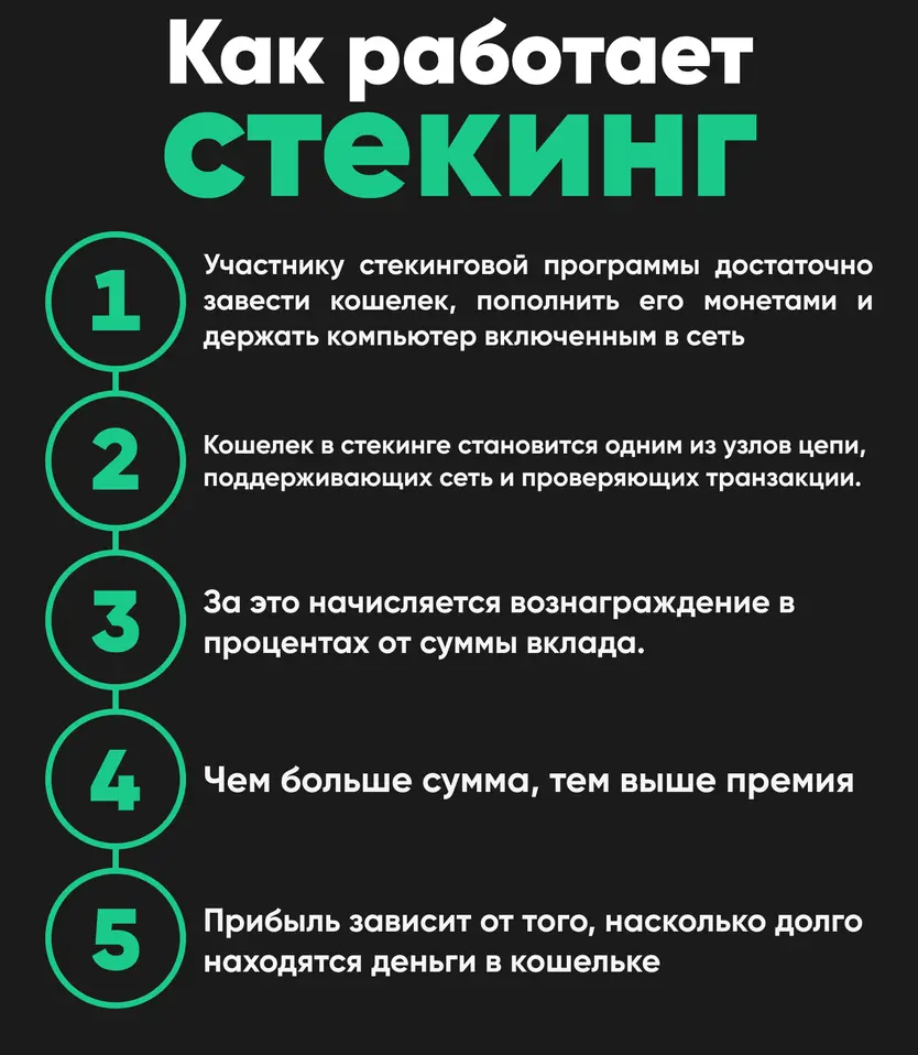 Участнику стекинговой программы достаточно завести кошелек, пополнить его монетами и держать компьютер включенным в сеть. Кошелек в стекинге становится одним из узлов цепи, поддерживающих сеть и проверяющих транзакции. За это начисляется вознаграждение в процентах от суммы вклада. Чем больше сумма, тем выше премия. А окончательная прибыль зависит от того, насколько долго находятся деньги в кошельке.