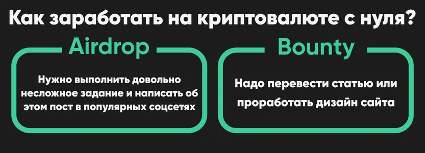 Заработать на криптовалюте с нуля можно, принимая участие в программах: Airdrop и Bounty. Эти два термина довольно часто путают, хотя они абсолютно разные, но это происходит из-за специфики криптовалютного рынка.