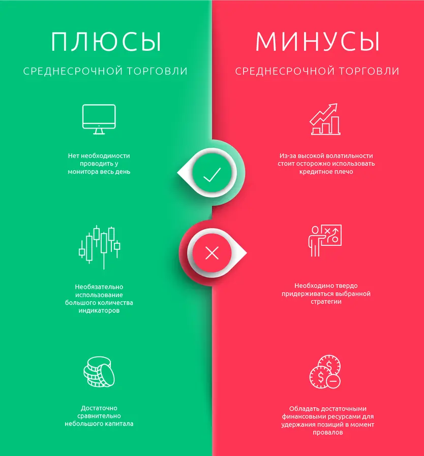 Во многом среднесрочный трейдинг похож на внутридневную торговли. В обоих случаях инвестор зарабатывает не на фундаментальном росте, а на волатильности того или иного актива. Традиционно среднесрочная торговля на форекс, как и среднесрочная торговля акциями — это прерогатива инвесторов, желающих заработать на скачках курса. С этой точки зрения среднесрочный трейдинг на криптобирже открывает перед инвестором множество возможностей, потому что криптовалюты остаются стабильно волатильным активом. Однако из-за высокой волатильности среднесрочная торговля на рынке криптовалют также несет в себе огромные риски: поведение конкретной валюты может быть совершенно непредсказуемо. Поэтому аналитики советуют начинающим инвесторам вначале последить за выбранными валютами в течение нескольких недель или месяцев и только затем начинать реальную торговлю.